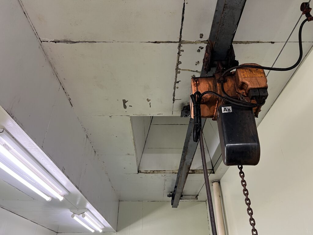 天井部に黒ずみが見られる 清掃では落としきれない汚れがある 食品工場として衛生面が気になる