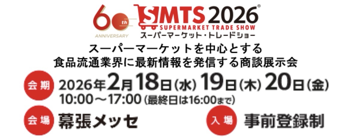 展示会名:スーパーマーケット・トレードショー2026 会期:2026年2月18日(水)〜20日(金) 会場:幕張メッセ