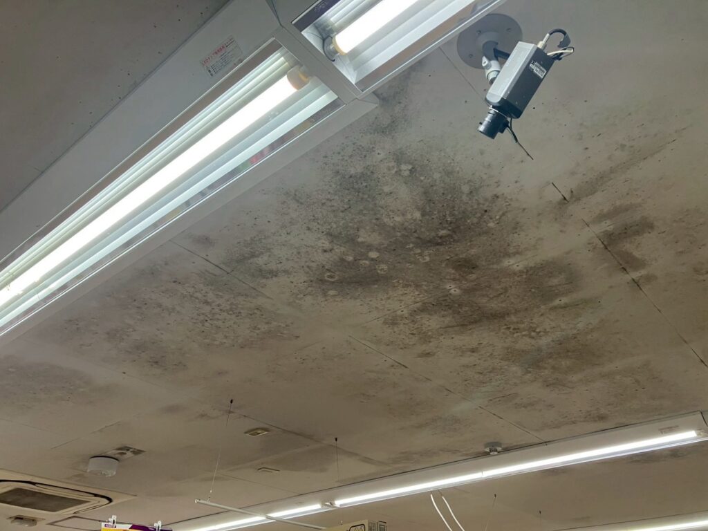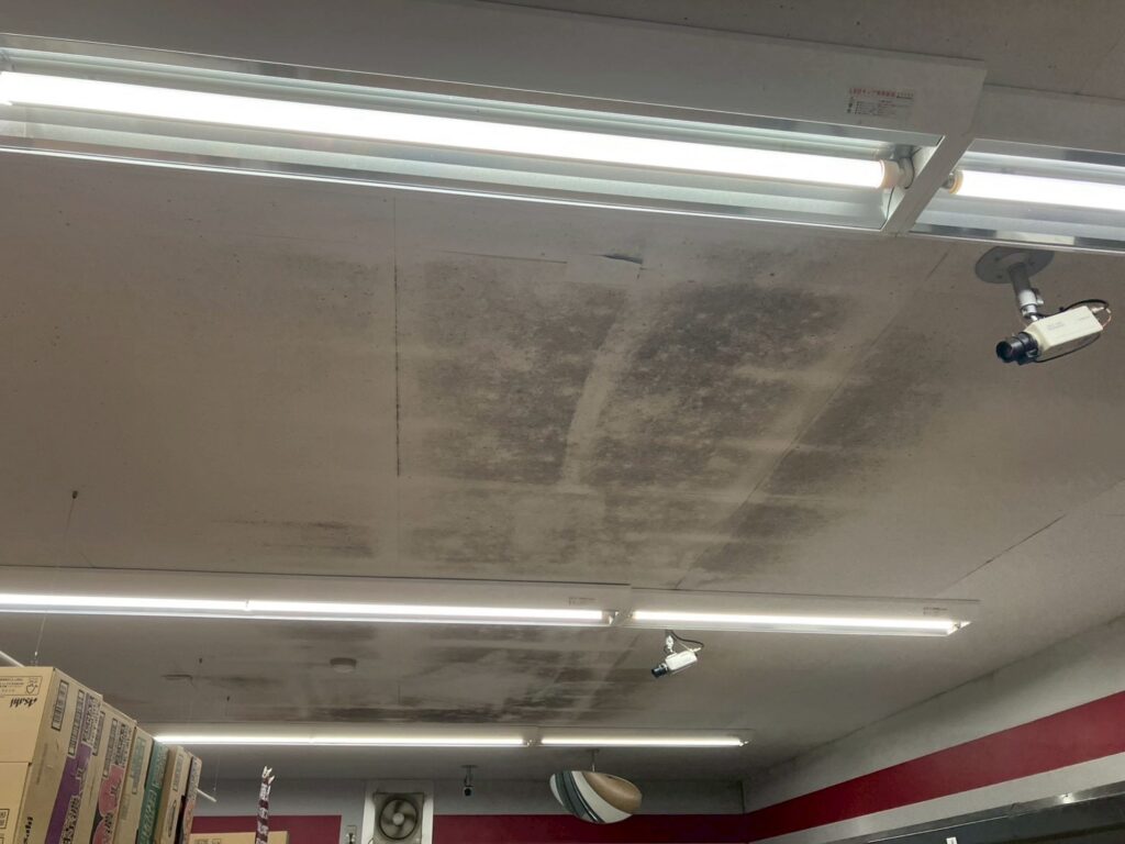 店舗内の天井には、広範囲にわたり黒カビの発生が確認され、